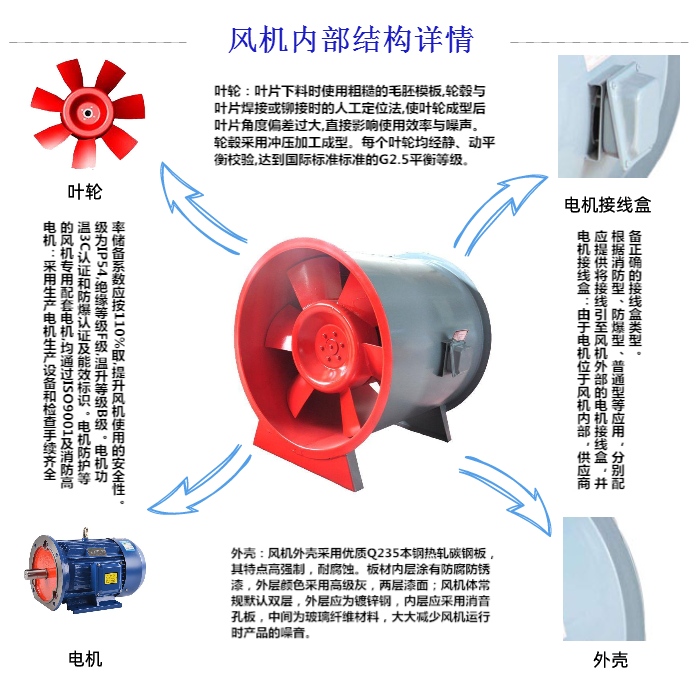 軸流消防排煙風機葉輪旋轉時,氣體從進氣口軸向進入葉輪,由葉輪上的葉片推動,增加氣體的能量,然后流入導葉。導葉將偏流轉化為軸向運動,并將氣體引入擴壓器,將氣體的動能轉化為壓力能,后引入運行管道。